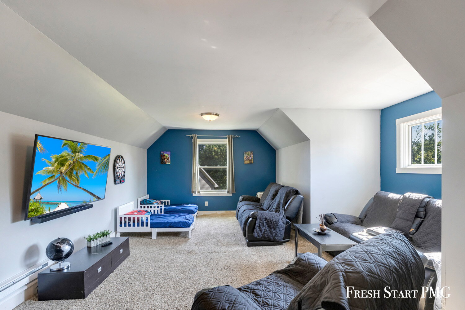 Upstairs, the primary suite features a private bath, along with two additional bedrooms and generous closet space. A second living room provides additional flexibility for relaxation, work, or entertaining.